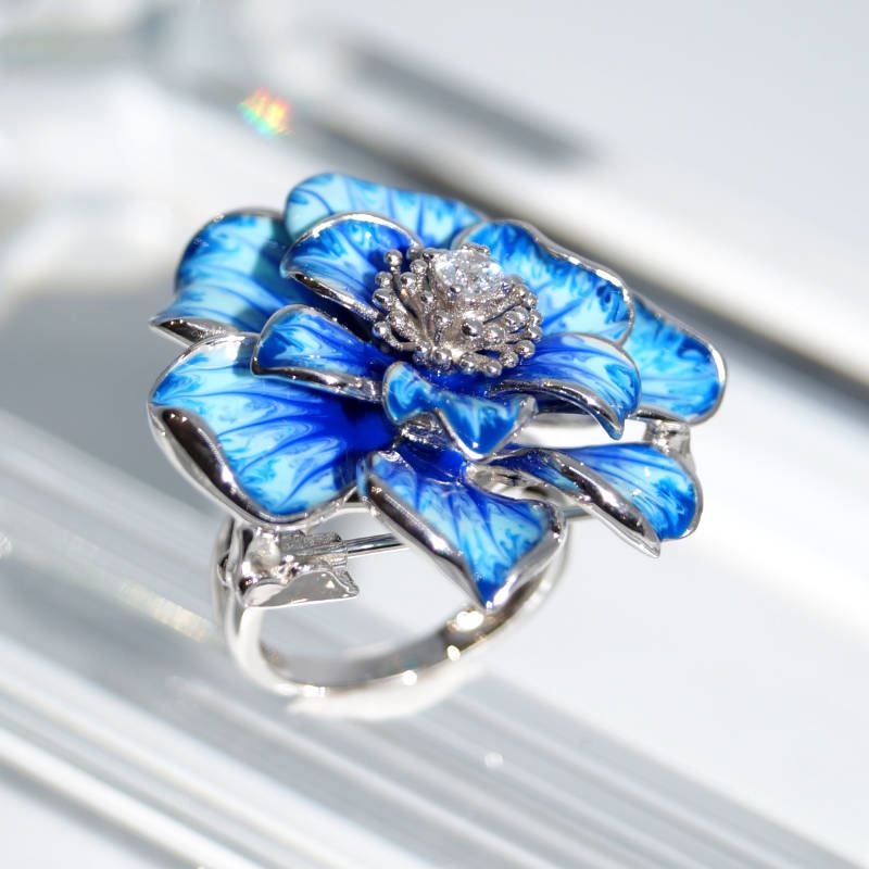 Découvrez cette magnifique bague en argent 925 rhodié qui allie élégance et polyvalence. Sa conception ingénieuse permet de dévisser la partie supérieure pour la transformer en une broche ou en pendentif, offrant ainsi plusieurs façons de la porter. Son design en forme de fleur émaillée de nuances bleues et sertie de zirconiums étincelants fait de cette pièce un véritable bijou de charme.