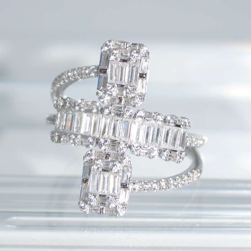 Cette bague en argent 925 rhodié incarne l’élégance contemporaine avec son design croisé unique. Deux pierres rectangulaires serties de zircons étincelants s’opposent dans une harmonie parfaite, tandis que l’anneau pavé de zircons renforce l’éclat et la brillance du bijou.